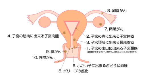 子宮の出口に出来る子宮頚がんと子宮の奥に出来る子宮体がん(内膜がん)です。